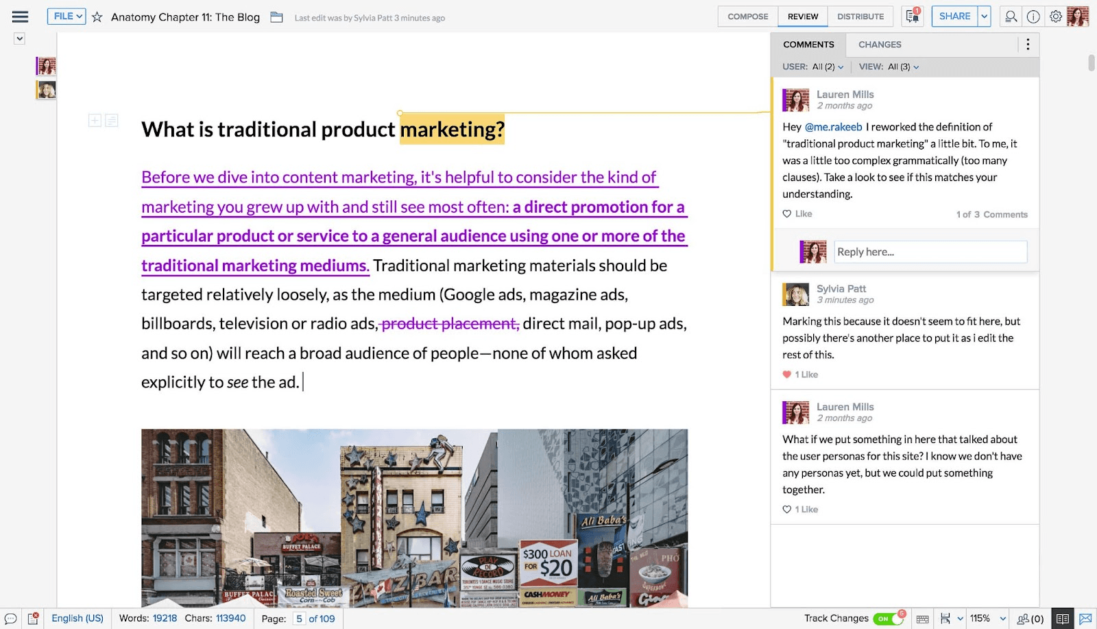 In Pages, you and your team can comment, share files, track changes to a document, etc.