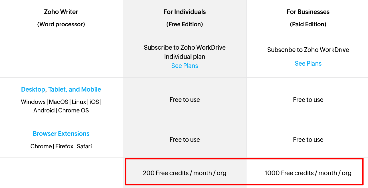Zoho Writer is free to use, but you need to pay with “free credits”.