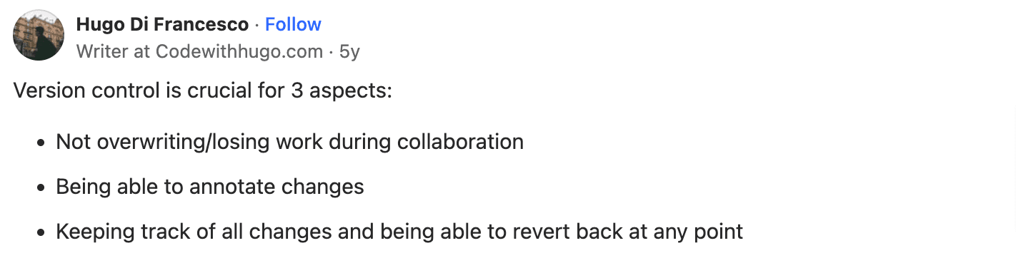 This topic was also discussed in a Quora thread, with Eurostar Technical Lead Hugo Di Francesco pointing out several benefits of version control: