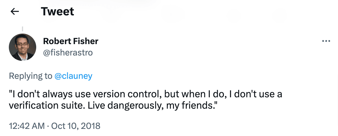 In fact, Dartmouth professor Robert Fisher even quipped about the dangers of using version control without a verification process: