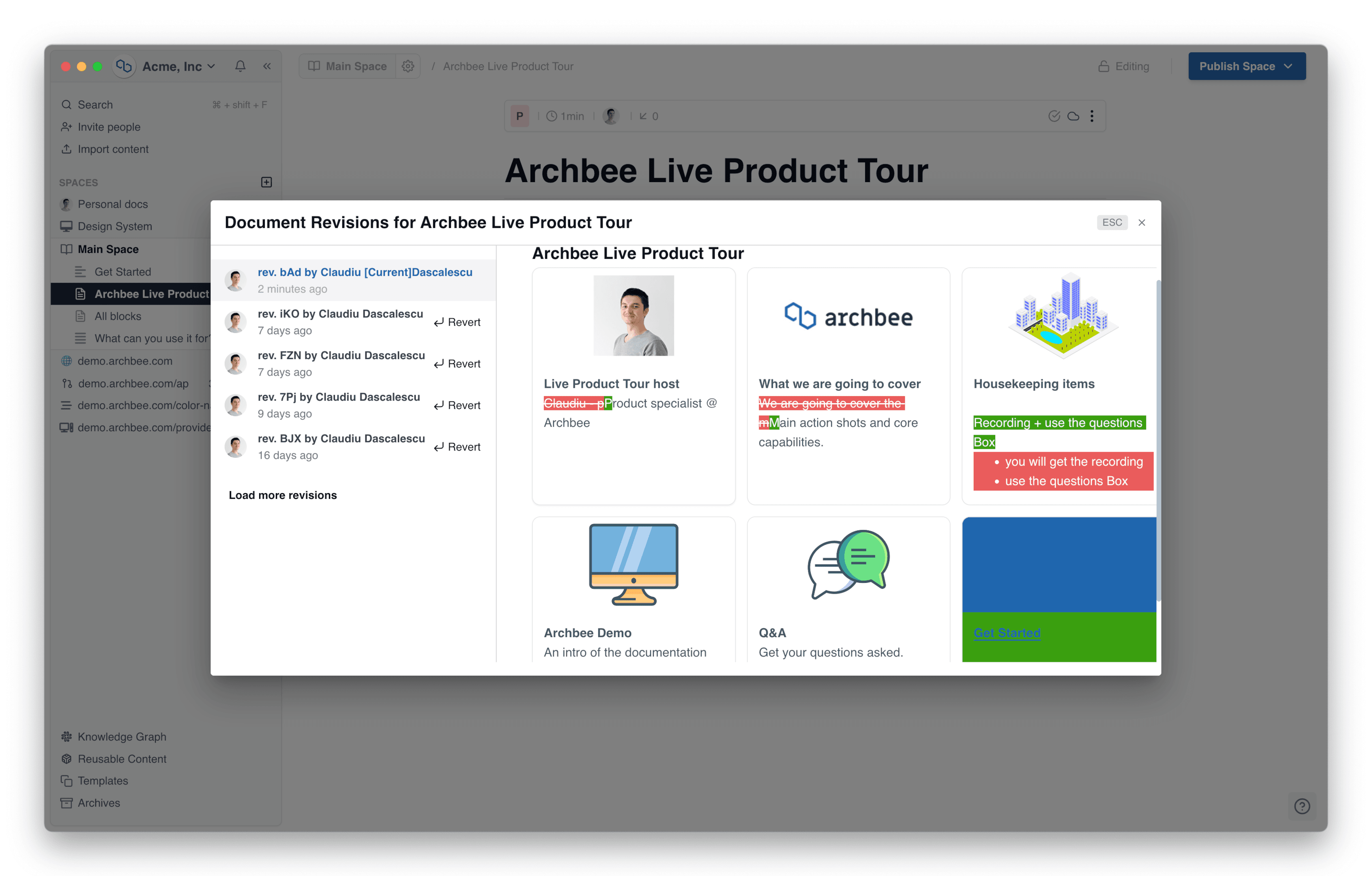 Additionally, Archbee provides built-in version control, allowing you to easily track changes, maintain a change log, and access previous versions of your documentation. This ensures that your documentation remains up-to-date and accurate while providing a historical record of its evolution.