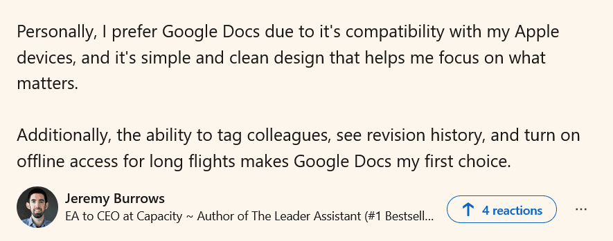For instance, below, you can see why Jeremy Burrows, author and public speaker, likes collaborating with his team in Google Docs.