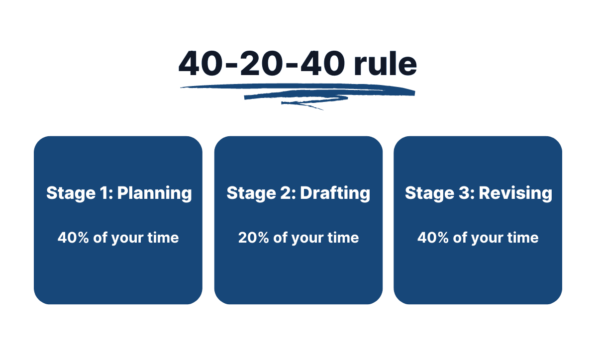 - Assign owners and timelines. As a guide, try the 40–20–40 split across planning/drafting/editing.