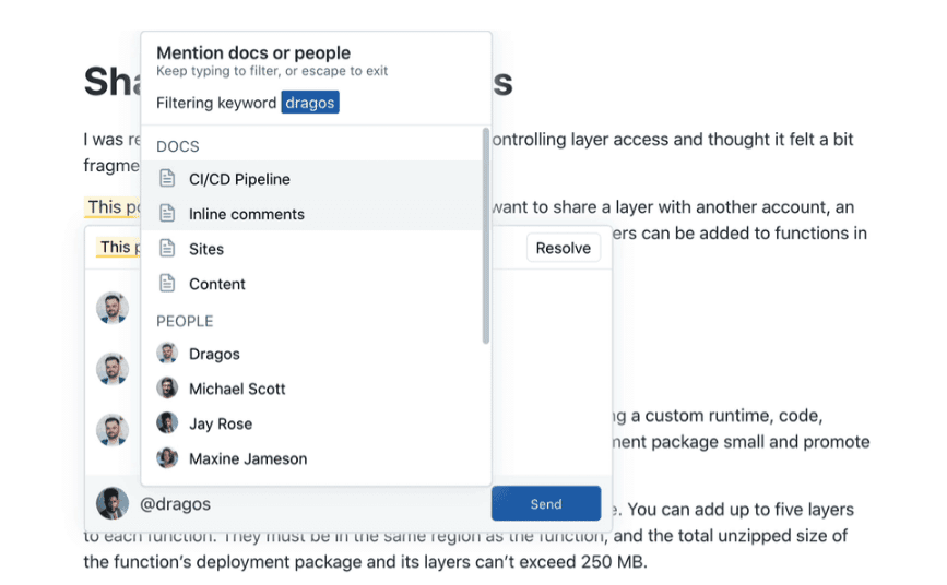 For instance, our own solution Archbee allows you to write comments in the documents, in which you can tag any team member.