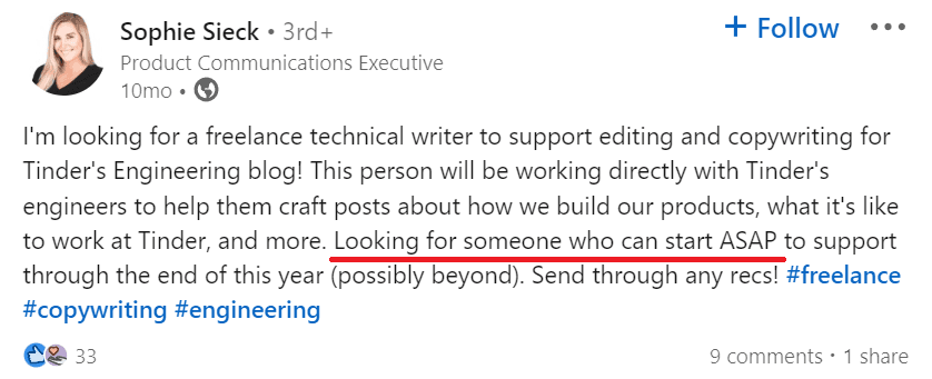 Another benefit of working with freelance tech writers is the fact that hiring takes less effort, making this a more convenient option for when you’re tight on time or budget.