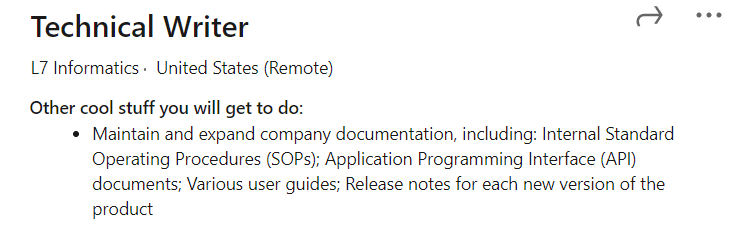 As the screenshot shows, the company states that they’re looking for somebody to work on user guides, API developer guides, and other large-scale pieces of technical documentation.