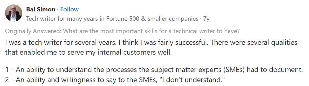 According to Bal Simon, an experienced tech writer, a good writer can understand the documented processes and ask SMEs for clarification when necessary.
