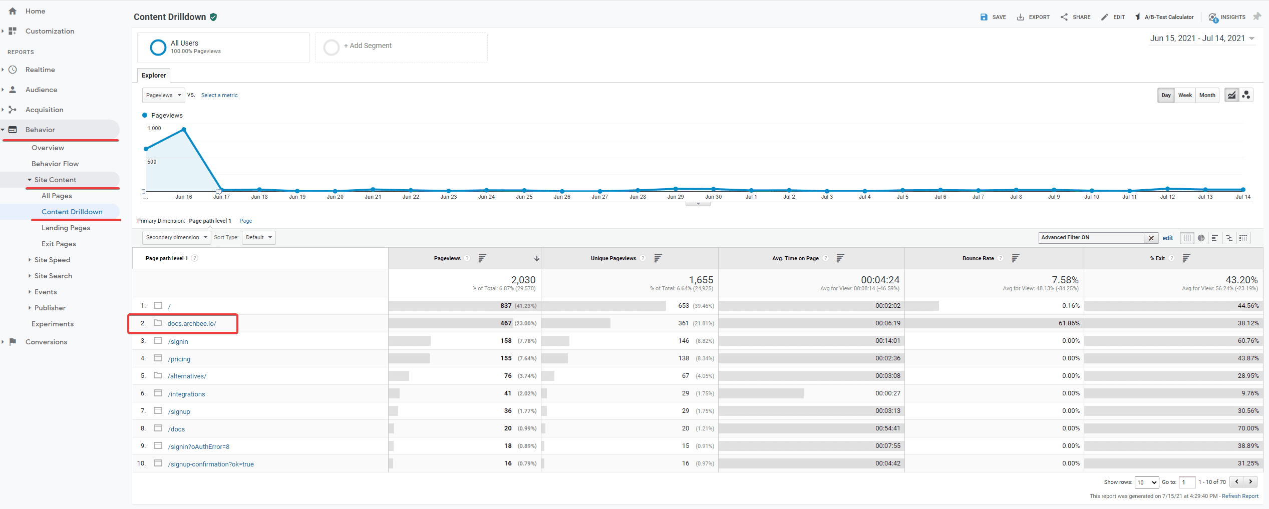 Log in to your Google Analytics, and then you go under Behavior -> Site Content -> Content Drilldown. Start with this view because it allows you to check a directory or page to learn how much traffic the docs site brings.
