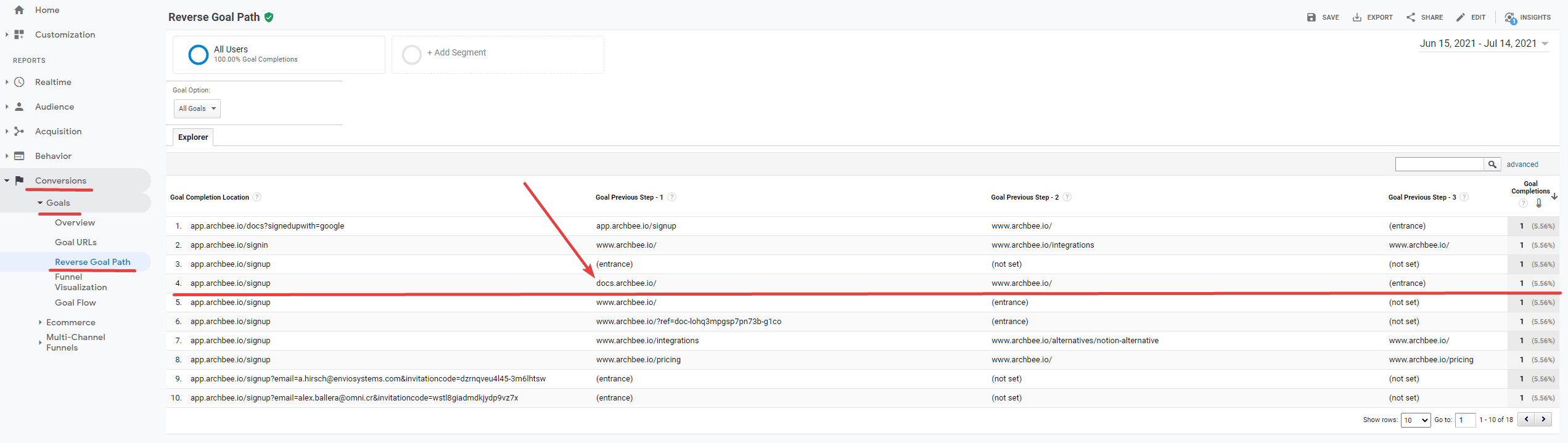 Continue to analyze your product documentation page's effectiveness in Google Analytics by going under Conversion -> Reverse Goal Path (check this article if you want to learn more).