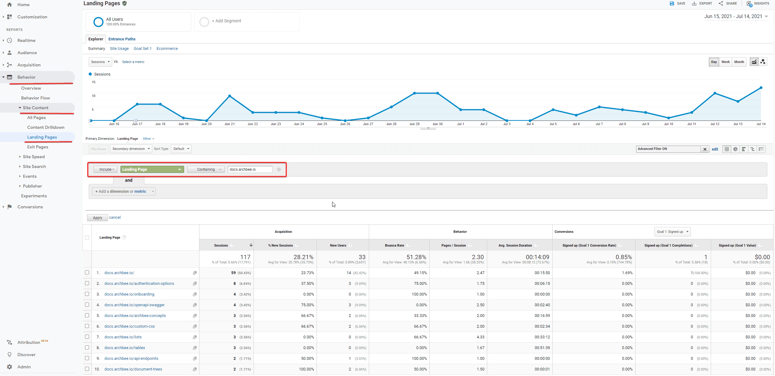Finally, we're going to look at the pages where a visitor first landed and how many conversions are there. We're going under behaviors, site content, and then landing pages.