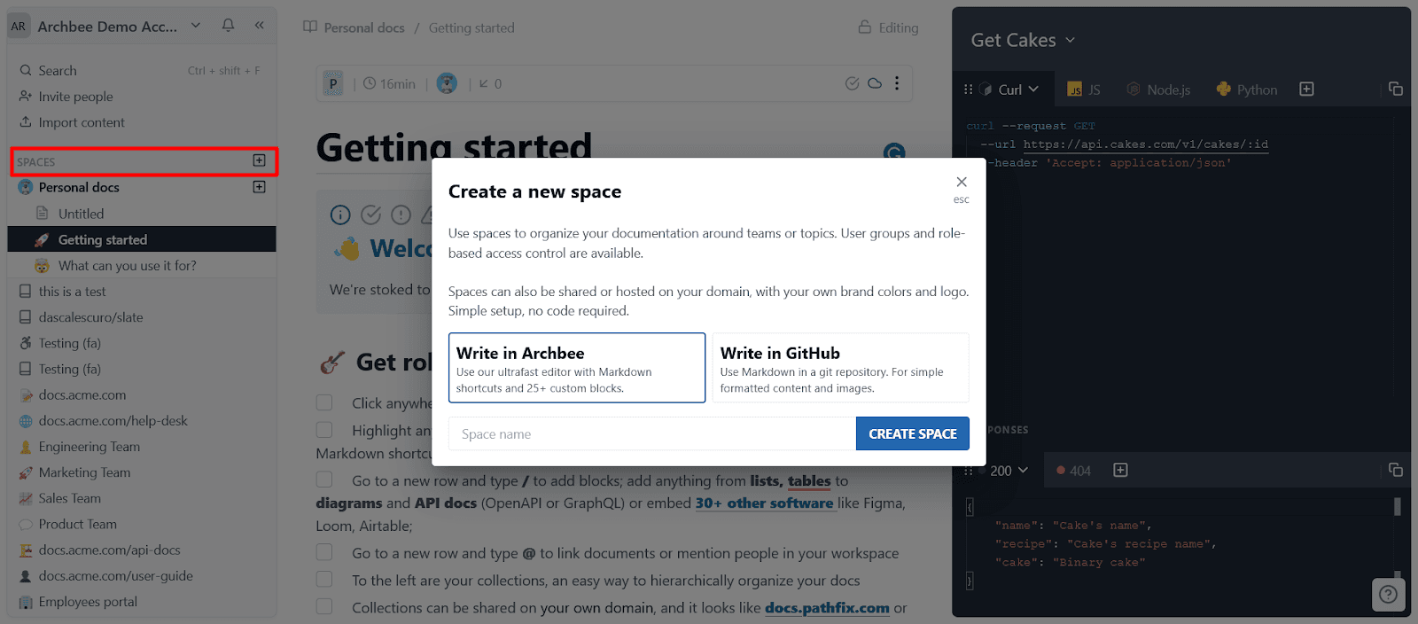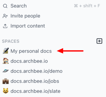 When a writer wants to start working in Archbee, they can create a draft in the Personal docs Space, which no one else in the team can access.