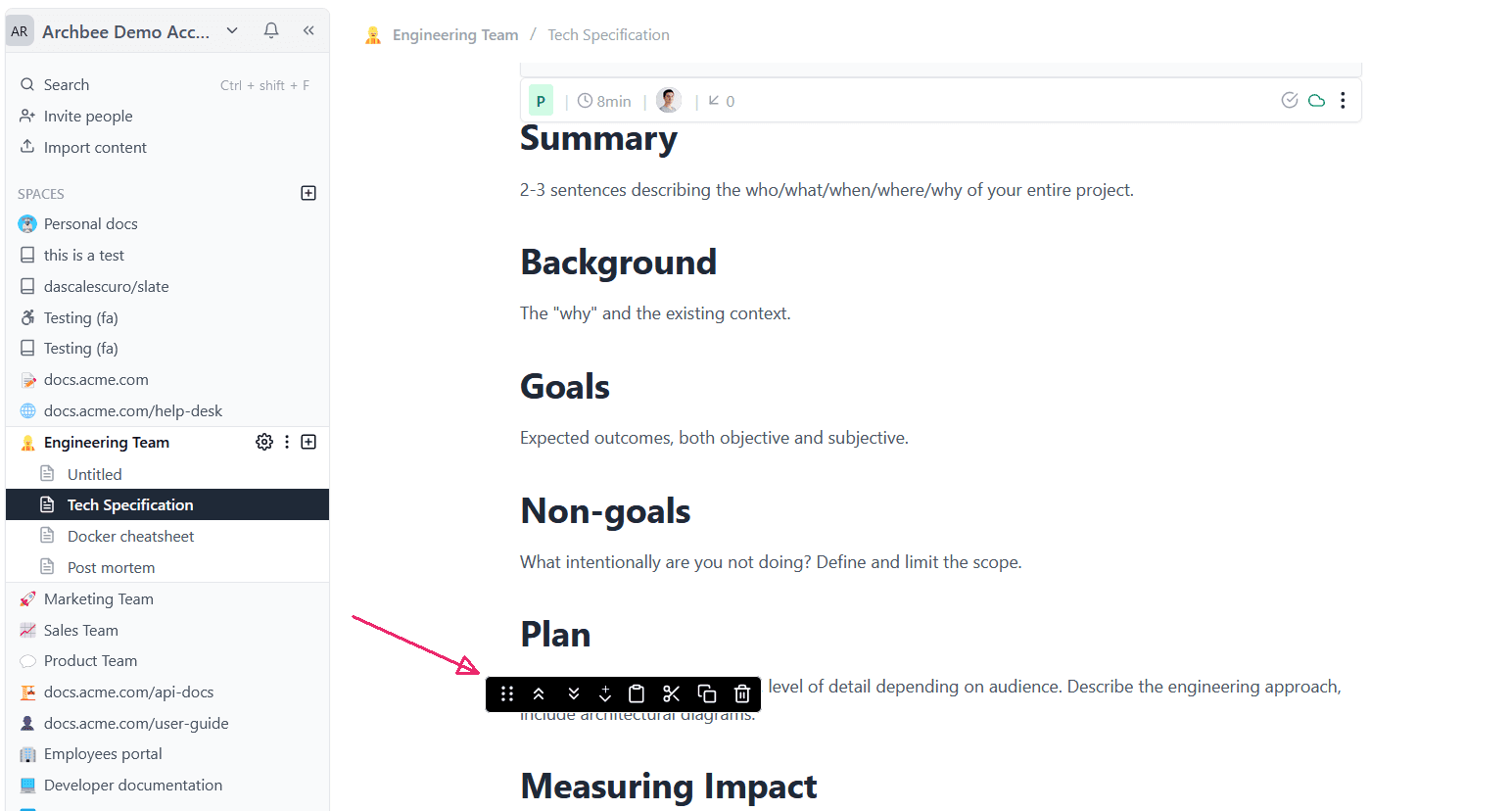 For instance, templates in Archbee show customization options when you hover your mouse pointer over text blocks.