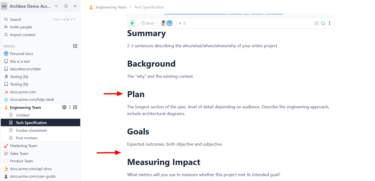 Archbee has technical writing templates that fall under several categories—Engineering, Marketing, Product, Sales, and Executive. Below is a full list of ready-made templates.