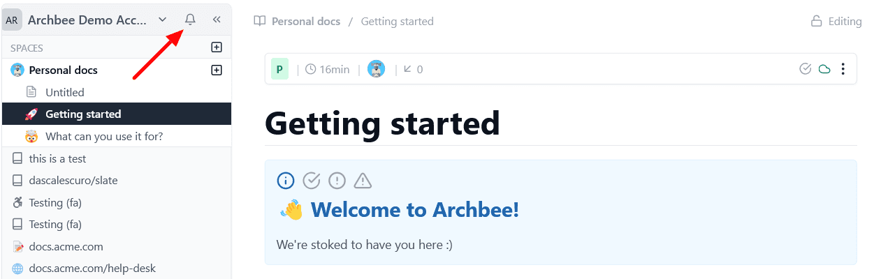 In Archbee, you can use the @ sign to mention people, and they’ll get a notification.