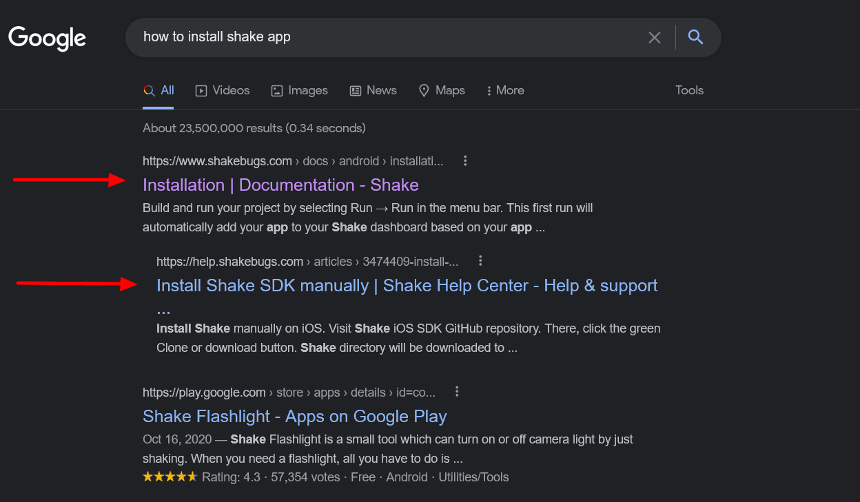 For example, if a customer purchased the Shake software tool for reporting bugs, the company that made it would certainly want their installation guide to be at the top of relevant search results—and it is.