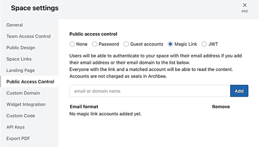 Public access control can be ensured in several ways, for example, by sending the authorized user a magic link they can use to access specific documentation.