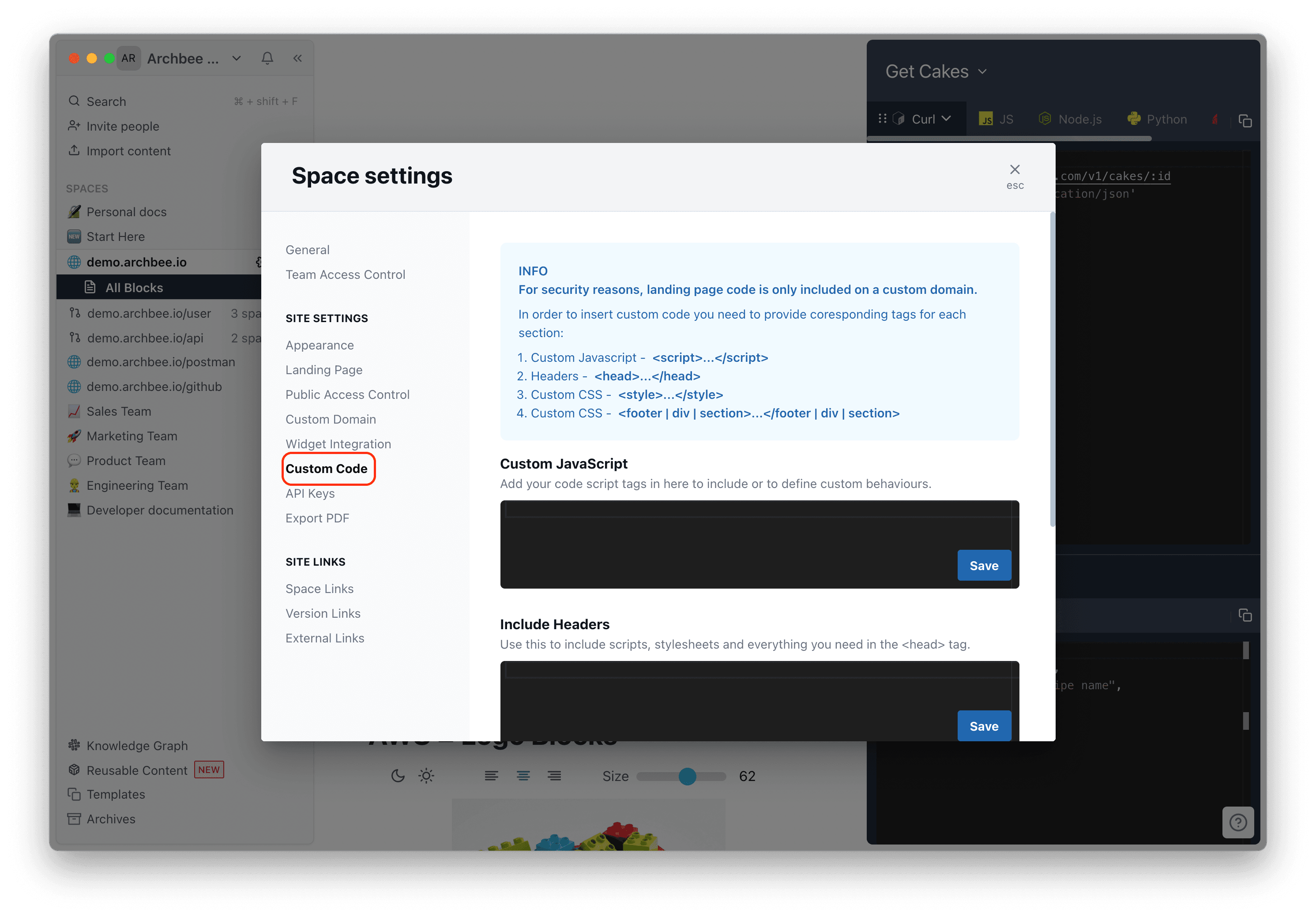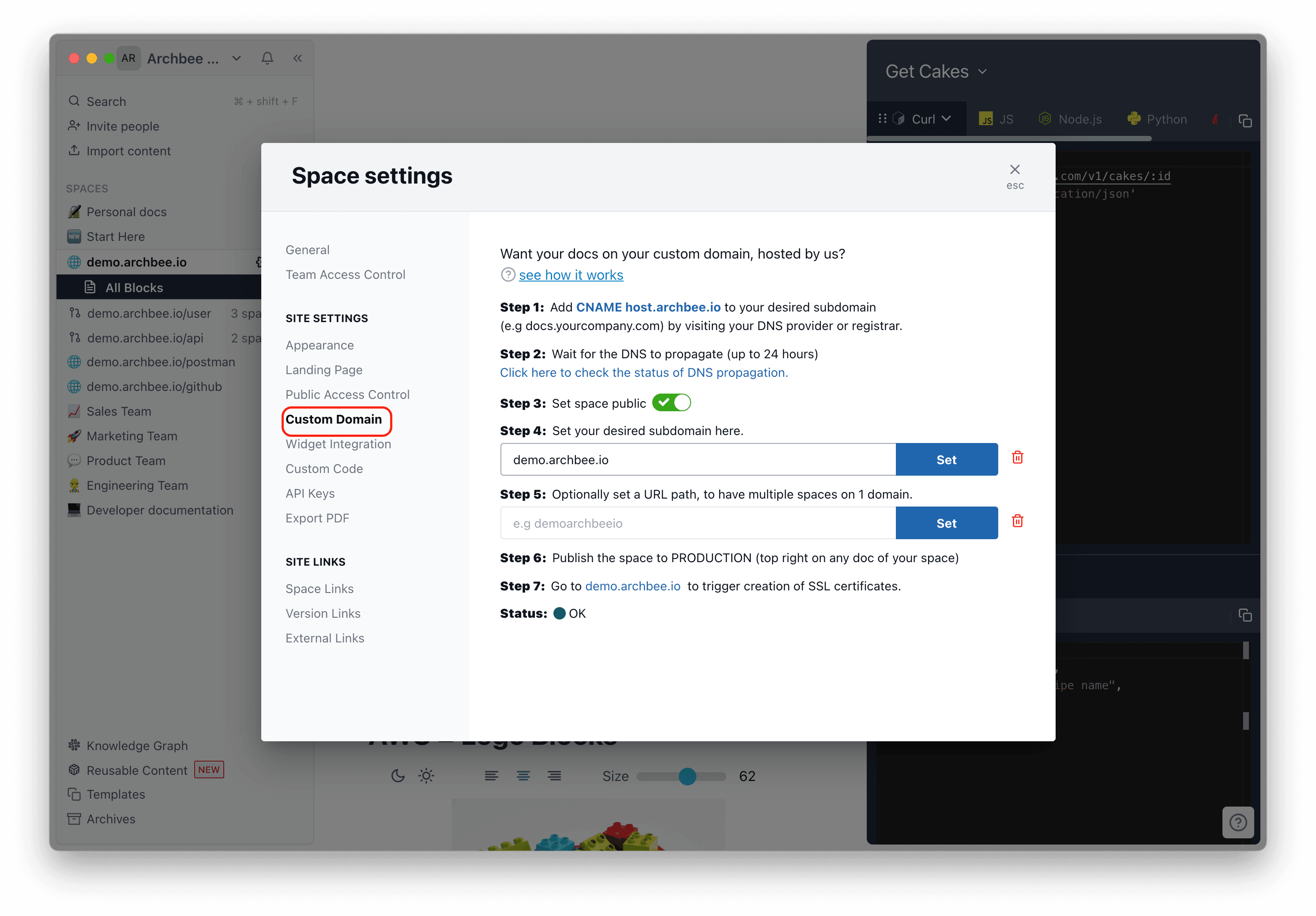 A Space is private by default, but you can share it on your subdomain when it's public, and Archbee handles the hosting (SSL certificate, CDNs, and image optimization are included).