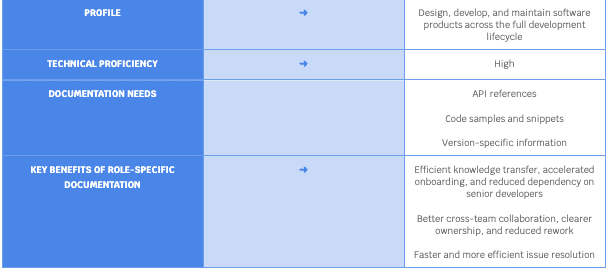 Developers, project managers, and other specialized roles each have their own ways of engaging with your product. Generic documentation is unlikely to address the different objectives, technical skills, and learning styles of everyone involved. Too often, a one-size-fits-all document also becomes overly lengthy and difficult to navigate.