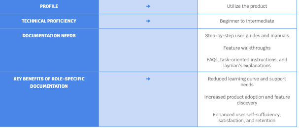- End-users want clear, step-by-step tasks, troubleshooting, and practical tips.