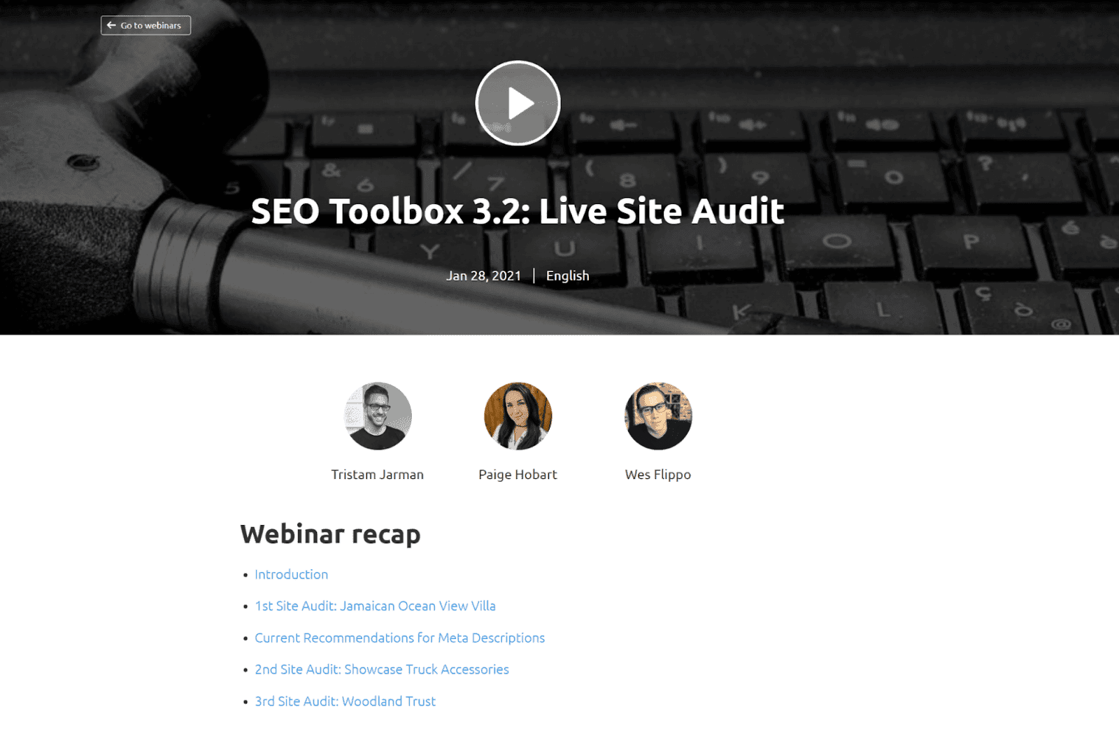 During their Live Site Audit webinar, SEMRush experts dissect a website using their audit tool (the product), live in front of a virtual audience, to find problems and suggest solutions to improve the site’s online visibility and SEO results.