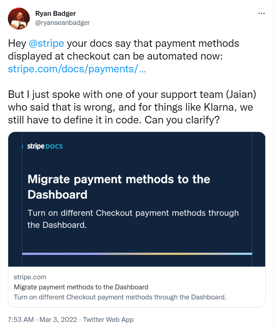 Here’s an example of a user asking for clarification for Stripe’s documentation on Twitter.