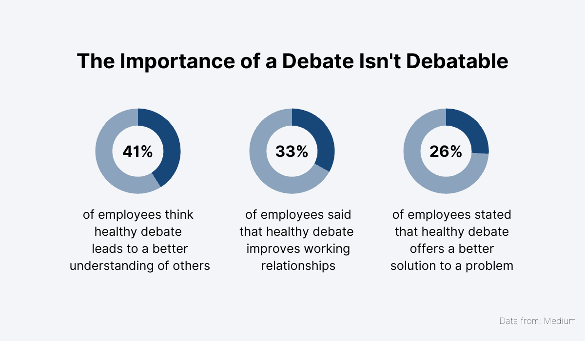 Chances are that your team will want to participate because a study revealed that 41% of employees think healthy debate leads to a better understanding of others, 33% said that it improves working relationships, and 26% stated that it offers a better solution to a problem or challenge.