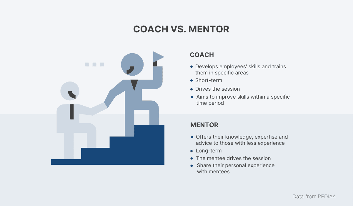Mentoring takes more time than coaching, because it's focused on the long-term development of the employees. As it's development-driven, it advises the mentees on honing their competencies.