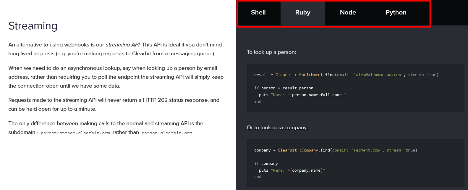 There are other methods, too. For example, some developer documentation, like Clearbit’s, shows code snippets alongside the text and includes tabs for different programming languages.