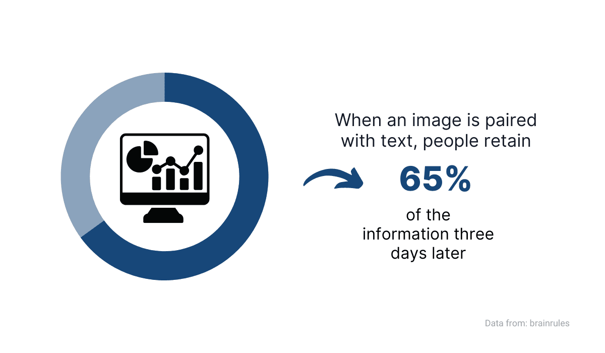 On the other hand, if that piece of information is paired with a visual, you’ll remember 65% of it in the same time frame.