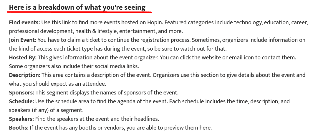 In Hopin’s example above, you can see brief explanations of what the screenshots represent.