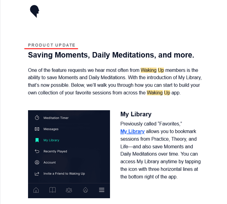 The team from the meditation app Waking Up announces new features with a detailed email.