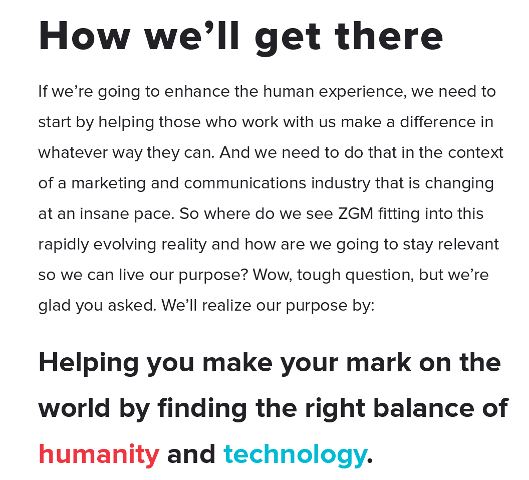 For example, an Alberta-based marketing agency called ZGM uses bolded text and colors very creatively in the employee handbook. Their goal is to create emphasis and ensure their employees won’t miss the most knowledge they want to instill in them.