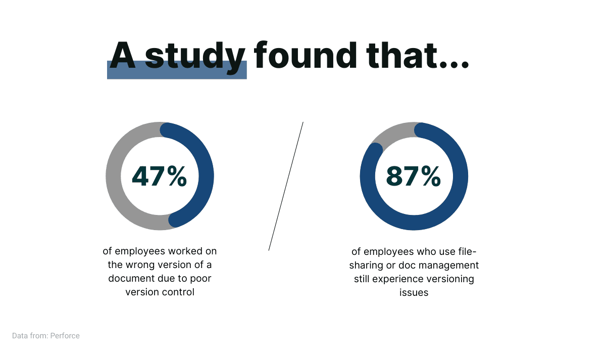 A study by Perforce stresses that almost half of employees reported working on the wrong doc version because of failed document collaboration.