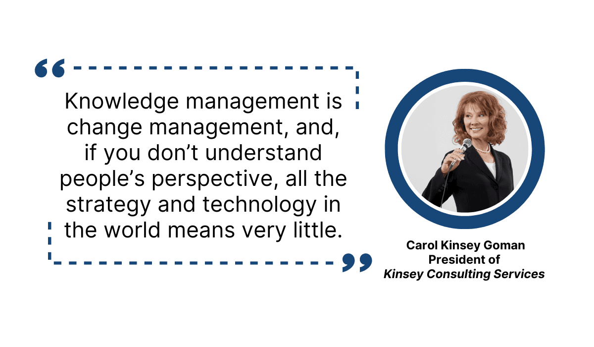 Consequently, Carol Kinsey Goman, Kinsey Consulting Services President, defines knowledge management as follows: