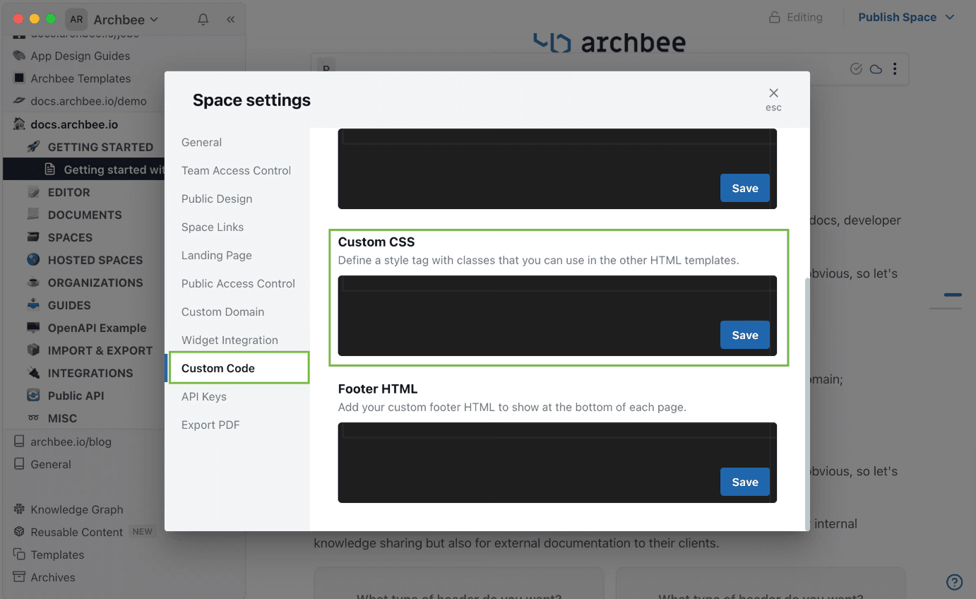 Here’s how to access the custom CSS settings on Archbee’s platform: