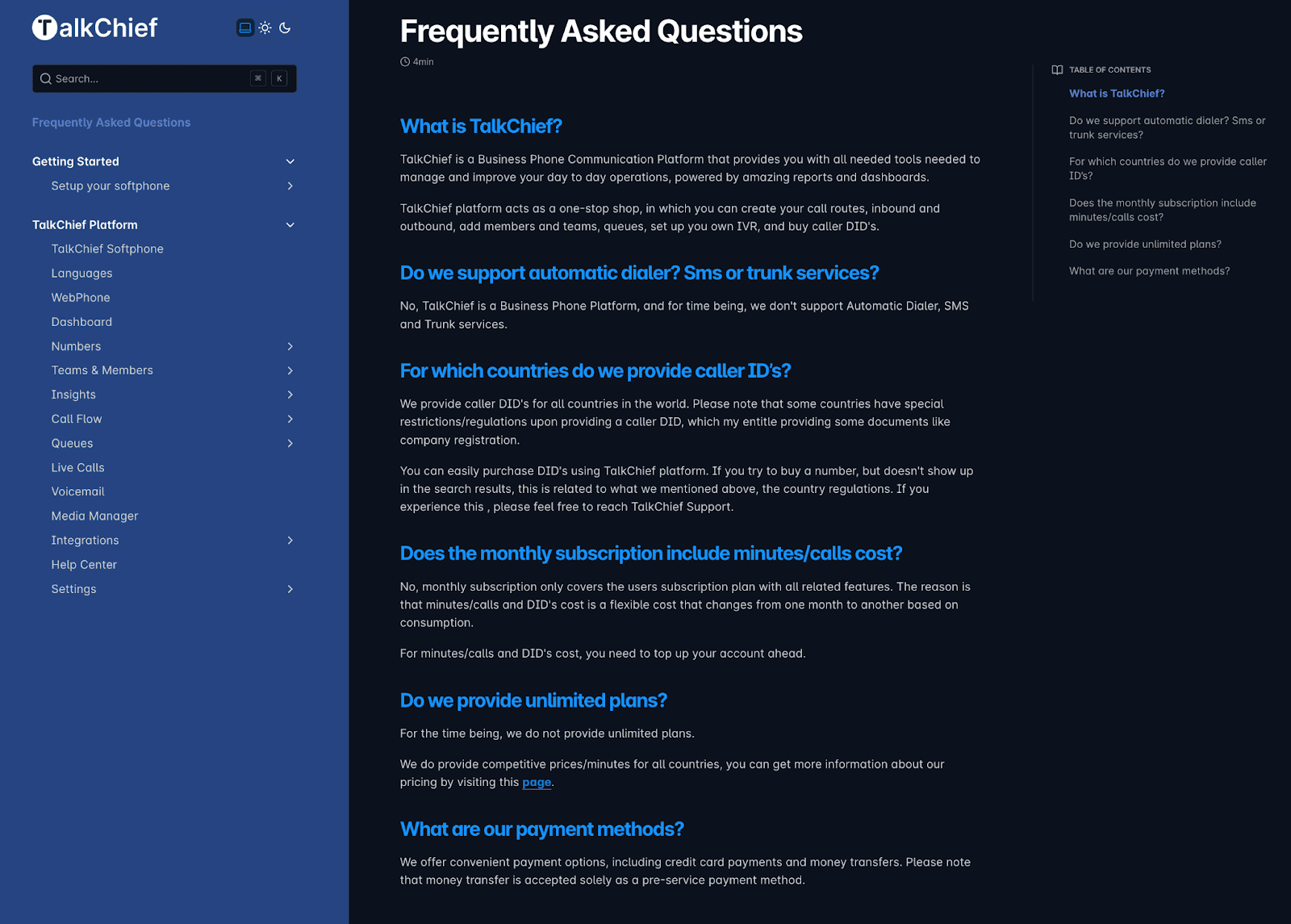 ✅ TalkChief, a business phone communication platform, has published an intuitive customer-facing knowledge base portal. This resource features dynamic FAQ content that makes it easy for their end-users to access the information they need—anytime, anywhere.