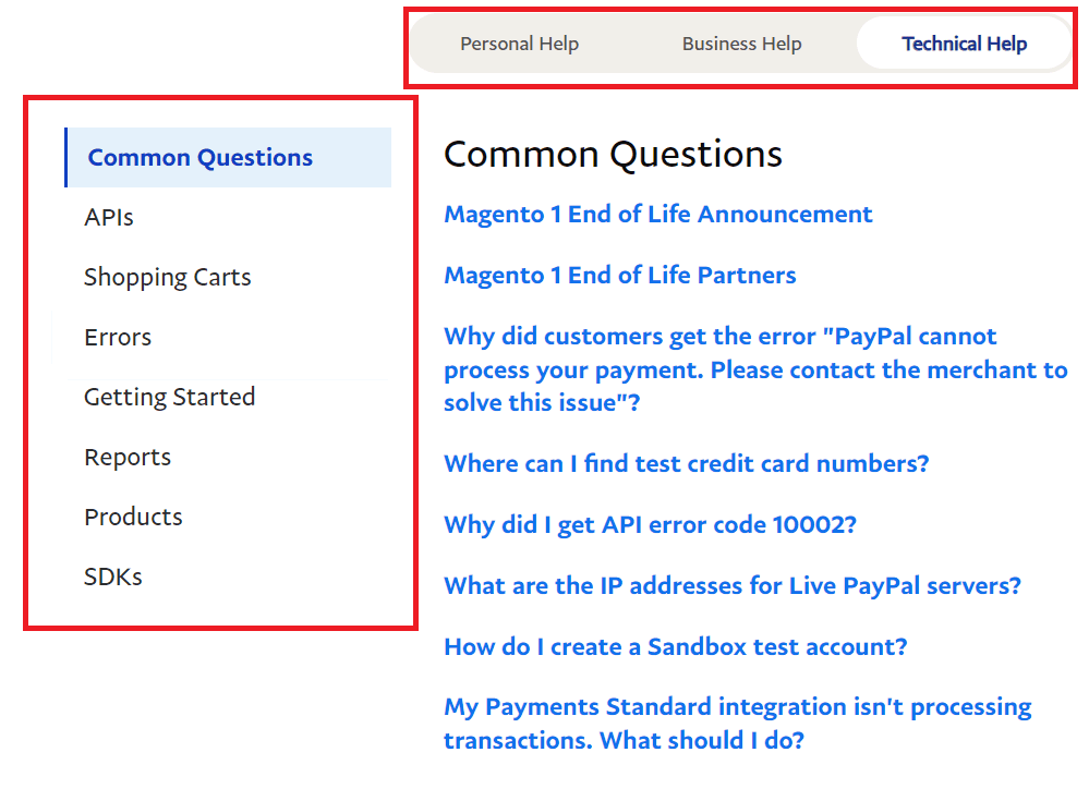 For example, PayPal’s help center covers the topics of personal, business, and technical help.