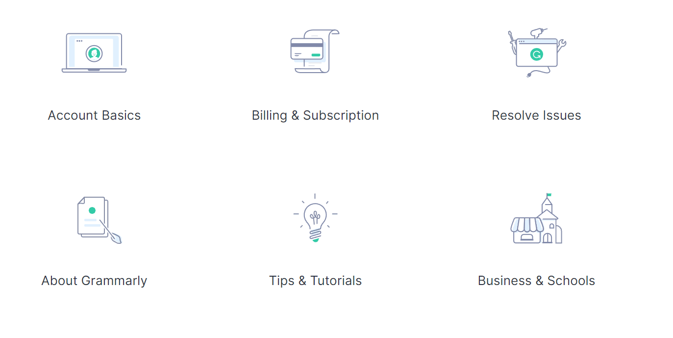 Let’s take Grammarly, a text editor, as an example. The company’s help center covers several areas where customers can solve their issues.
