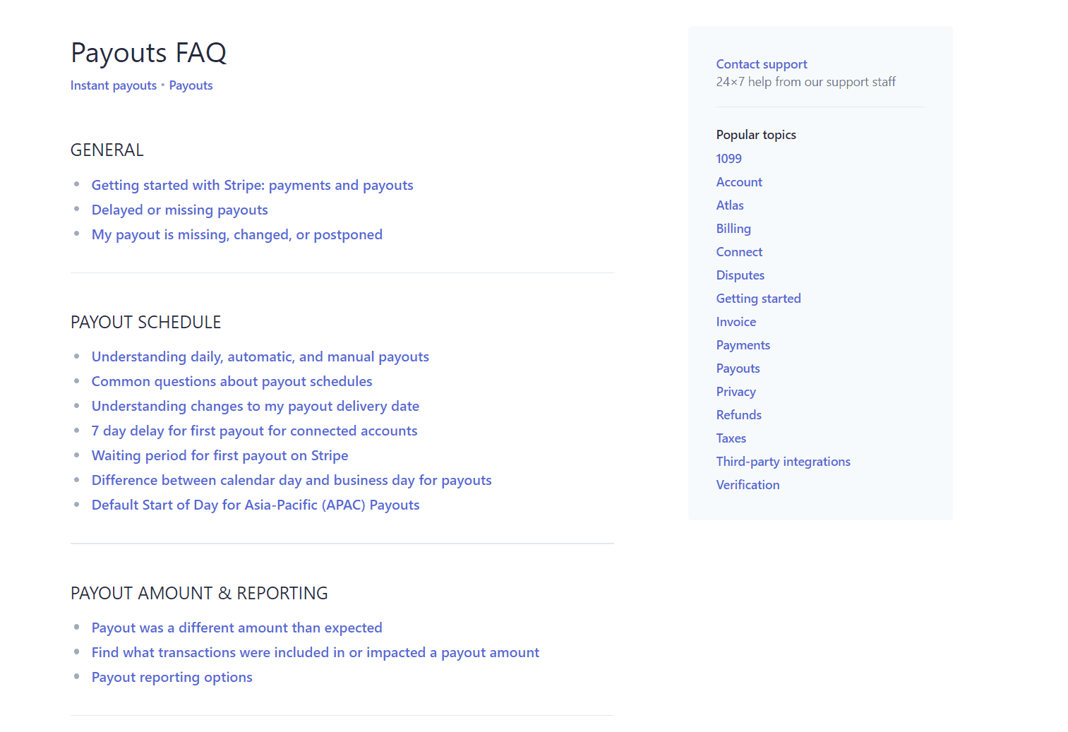 For example, here is an excerpt of the payouts FAQ from Stripe’s support knowledge base. As you can see, questions are divided into categories such as schedule, amount and reporting, negative balance, and more.
