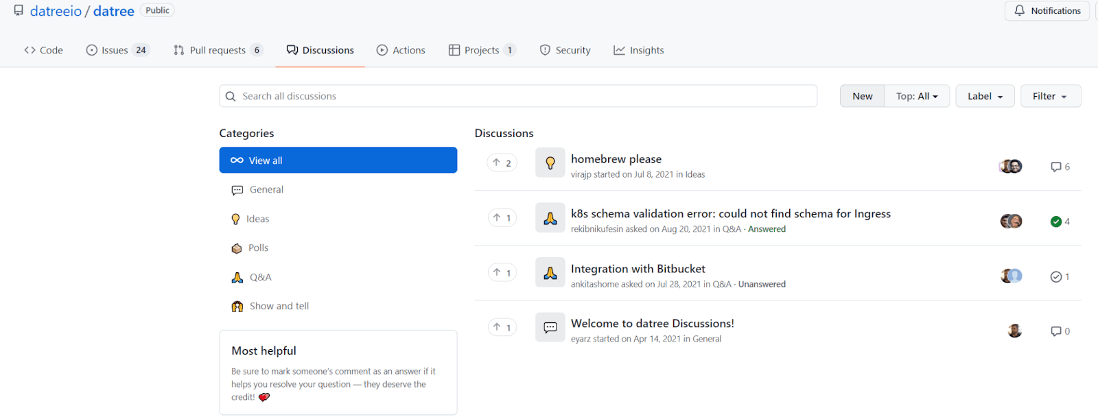 Datree redirects support-related questions to a designated GitHub discussion board.