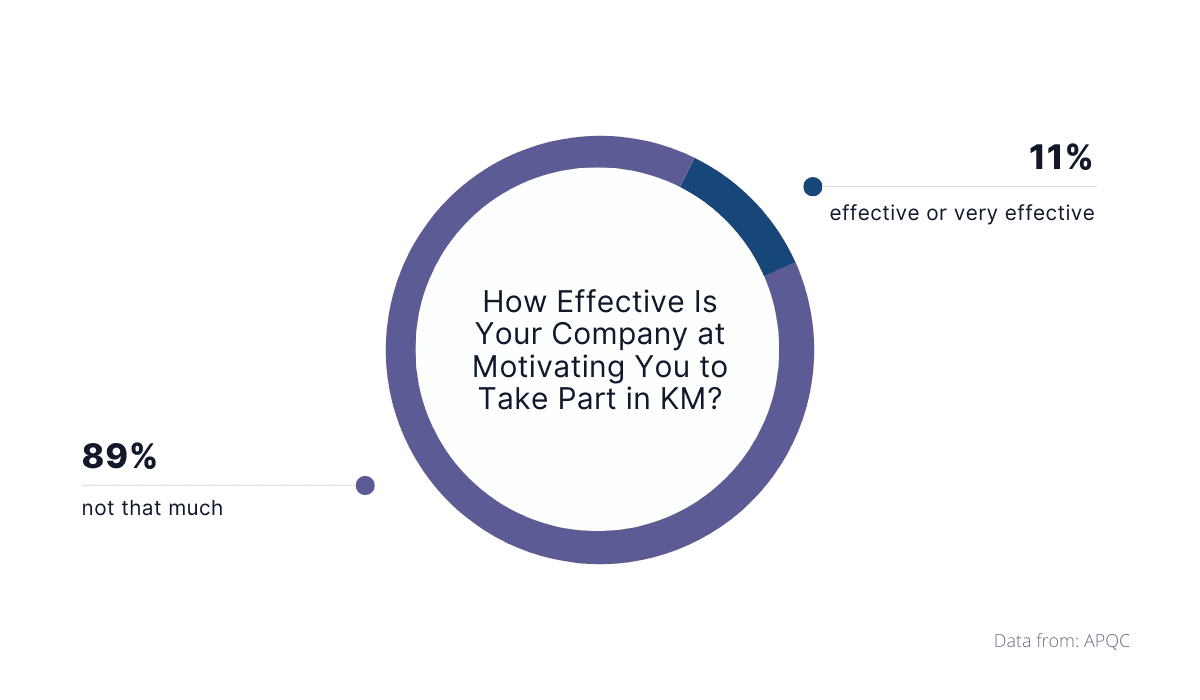 Although this may seem obvious, many companies still don’t get it right. APQC survey shows that only 11% of employees think their company’s attempts to motivate or incentivize them to take part in KM are effective or very effective.