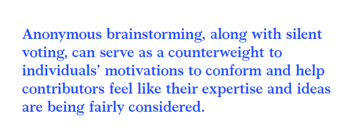According to experts at McKinsey, anonymous brainstorming helps people share their insight because of the fairness of the setup.
