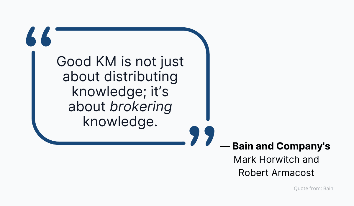 Bain & Company’s former Vice President and Director, Mark Horwitch, and Robert Armacost, former Director of Knowledge Management, think that the company should distribute and broker knowledge.