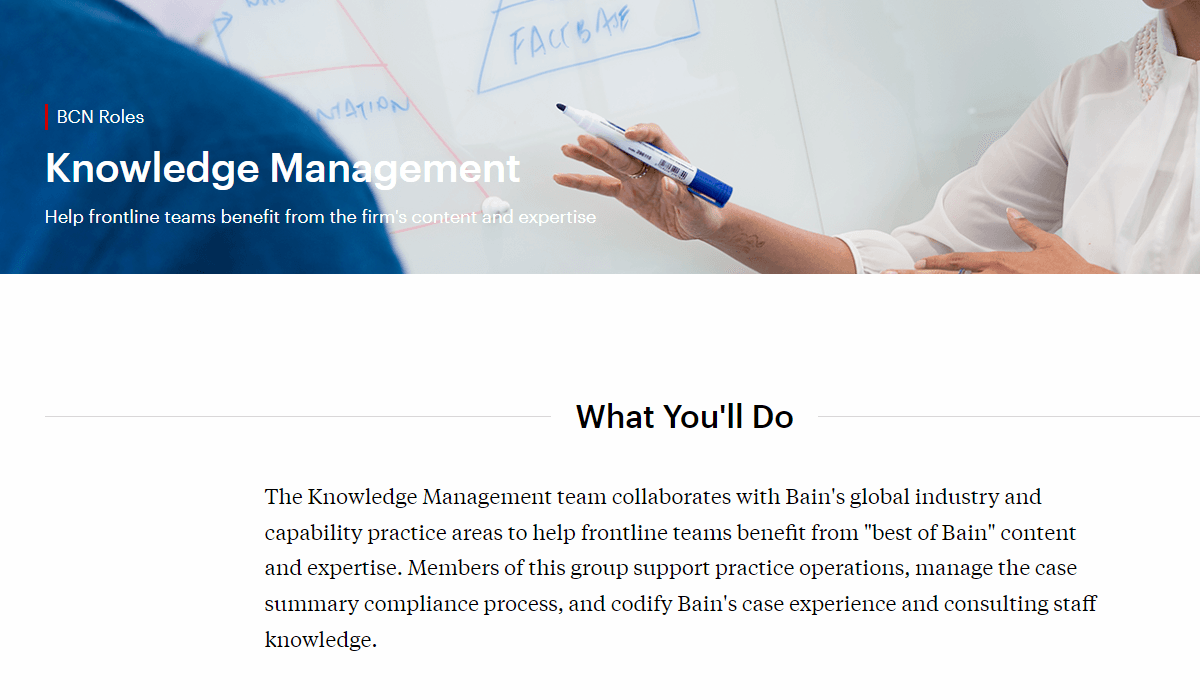 For instance, HBR explains that Bain & Company, a management consulting company, uses a personalized knowledge strategy for their KM.