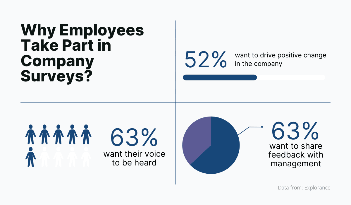 The reasoning behind completing surveys is simple—employees want their voices to be heard, share feedback with the management, and drive a positive change in the company.