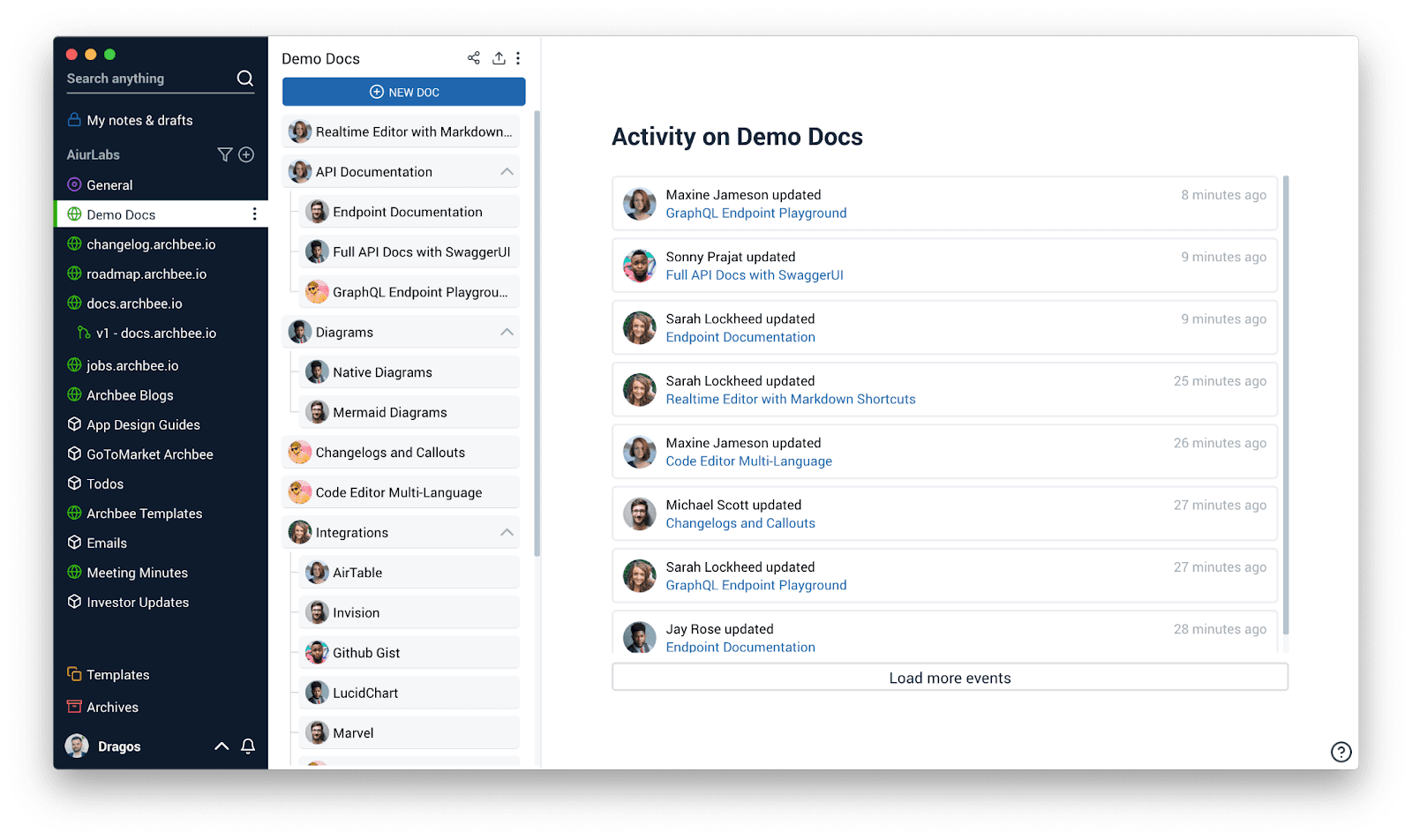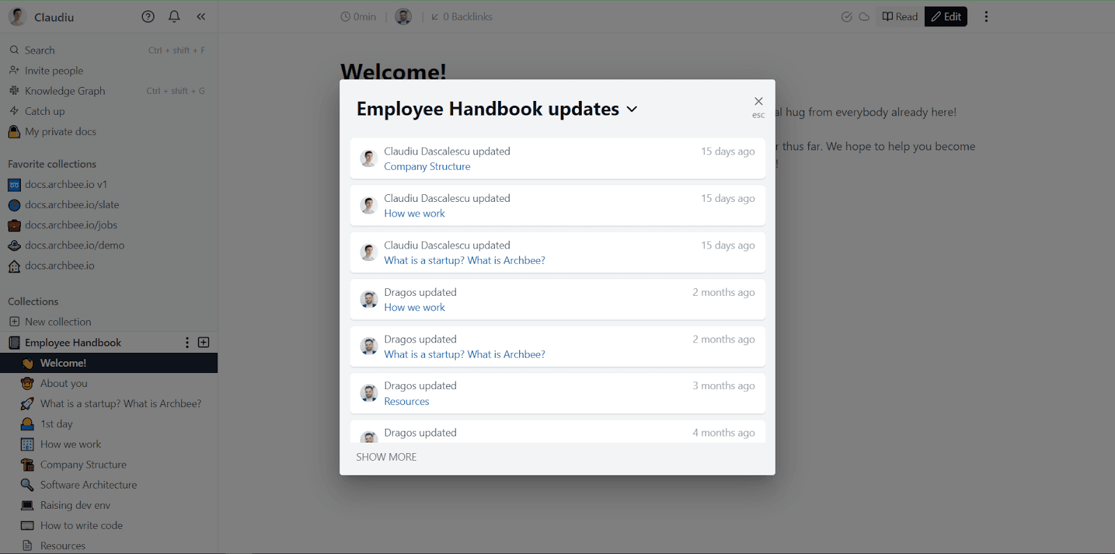 For example, Archbee allows you to add documentation, let specific users edit it, and allow others to review the updates before hitting “publish”, thus enabling you to undo a change.