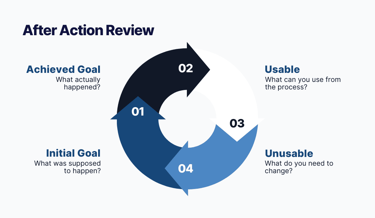 An after action review allows you to analyze a process in detail to figure out what happened and how to improve certain aspects of it. That way, you also share knowledge about it.