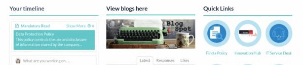 When employees log in, they can see their timeline and any relevant changes, read new blogs, or access their quick links, such as “find a policy” or “IT service desk.”