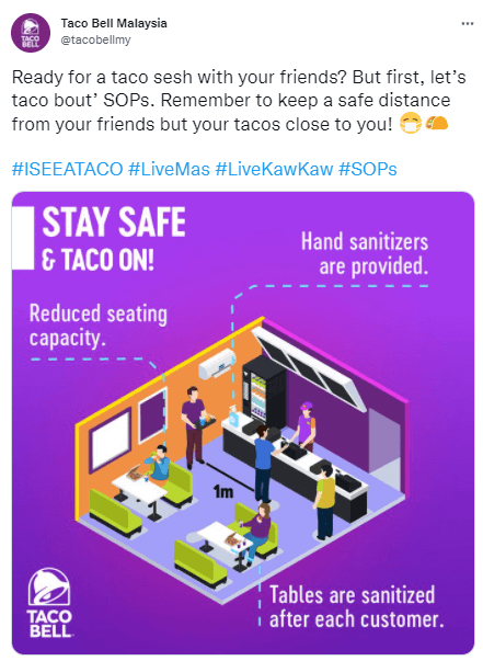 Here’s a fun example from Taco Bell Malaysia, which has published a summary of their SOPs on their Twitter account, thus showing the world what they can expect in their restaurants during the pandemic.