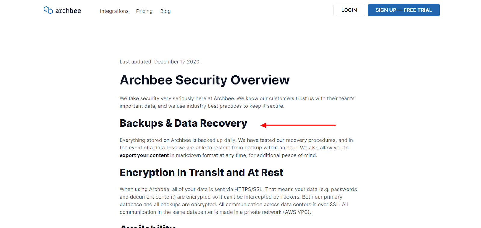 For example, Archbee has a daily backup and can restore lost data within an hour.